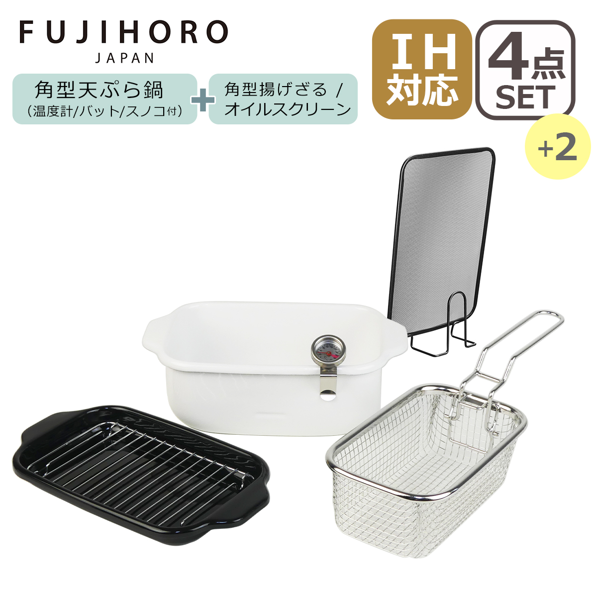 | 富士ホーロー 角型天ぷら鍋 ホワイト(TP-20K.W)+ ポコフリット 角型揚げざる(RG-0561)+ ポコフリット オイルスクリーン(RD-0098) ※ポコフリットは和平フレイズの商品です |