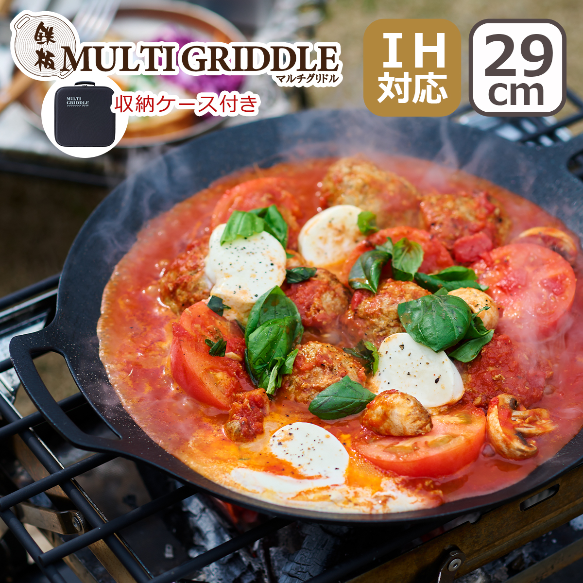 ・アウトドアのキャンプ飯に最適な鉄板マルチグリドル ・高い熱伝導率で「焼く」「炒める」「煮こむ」など、食材の旨味を引き出しながらいろんなお料理が楽しめます ・自然に馴染むような木製のグリップは竹節のように凹みを持たせたことで持ちやすくなっており、デザイン性と機能性を兼ね備えたアイテムに ・丈夫で軽いコルク製の鍋敷き ・スッキリとまとまり持ち運びがしやすい専用ケースは、本体と付属品以外の小物も収納が可能 ・本体裏面の筋が増えたことで、様々な五徳に対応が可能に ・直火・IHのどちらにも対応、本体中心部分が約4cmほどくぼんでおり、水分が多い煮物や鍋料理にも ・少量の油で揚げ物も可能 ・アウトドアだけでなくおうちごはんの調理器具として、お料理好きな方にもお勧めしたくなる優れもの ・油が無くても焦げ付きにくく、後片付けも楽々 ・アウトドアやキャンプ時に手軽に持ち運べる軽量アルミ合金製 |