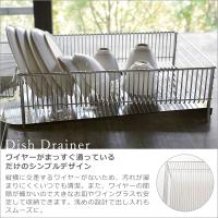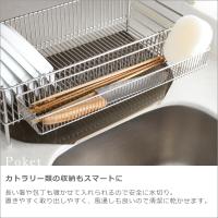 使いやすさを追求した結果、まっすぐのワイヤーが並んだシンプルな仕様に。溶接部分が少ないから水垢がたまりにくく、水キレの良い衛生的なデザイン。トレーは斜めに傾いているので、水がトレーにたまらずシンクに流れる便利な設計。付属のポケットはカトラリーや小物入れに。