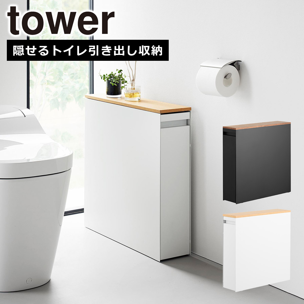 | 隠せるトイレ引き出し収納 タワー トイレ用品を省スペースに隠しながら沢山収納できる スタイリッシュな収納ラック トイレの狭い空間でも、様々なトイレ用品の一括収納ができるスリムな引き出し式ラックです。幅僅か14cmの細長いラックで、トイレブラシやサニタリー用品、トイレットペーパーなどを綺麗に区分けして収納できます。トイレブラシ収納部は使い捨てトイレブラシにも対応。キャスター付きの引き出しで、使わない時は全ての小物を隠せ、スッキリとしたトイレ空間になります。高さが55cmと低めに設計されているので、手洗いカウンターの下にも収まります。天板は天然木でできており、シンプルでスタイリッシュ!芳香剤やインテリア、スマホなどを一時置きする台としても使え、大変便利です。スチール製なので、側面にお手持ちのマグネット収納アイテムなどを取り付けて、更に収納の幅を広げるのも◎本体の底面には底板があり、ホコリなどが下から引き出しの中に侵入するのを防ぎます。 |