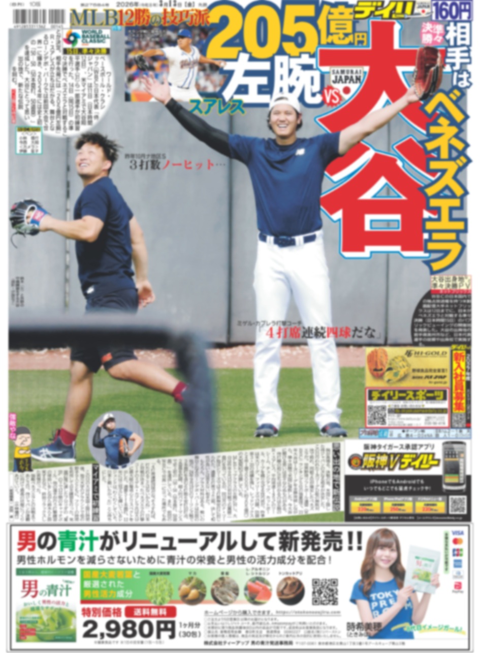 ・一面:相手はベネズエラ 大谷VS205億円左腕