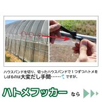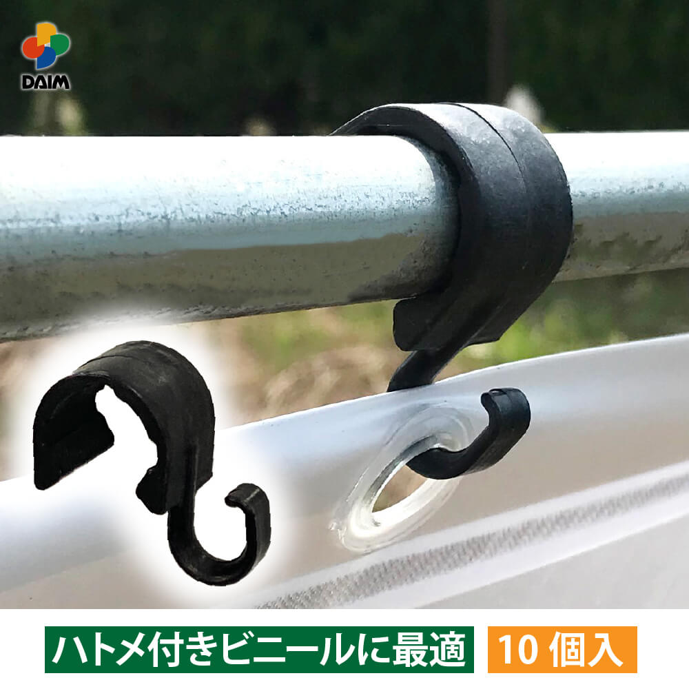 商品名:ハトメフッカー・ハトメ付きビニールの取り付けに最適。・フックにハトメをひっかけ、支柱に取り付ければ作業が完了します。・フックは”返し”付きでビニールが外れにくくなっています。・ハトメ付きの遮光ネット、防風ネット等にも使えます。適合サイズ(約):適合支柱:外径19〜20mm カラー:ブラック 重量(約):10個あたり60g パック内容:ハトメフッカー 10個 注意事項 ※高所での取り付け作業となる場合は、危険がないよう十分にご注意の上、必ず2人以上で行ってください。