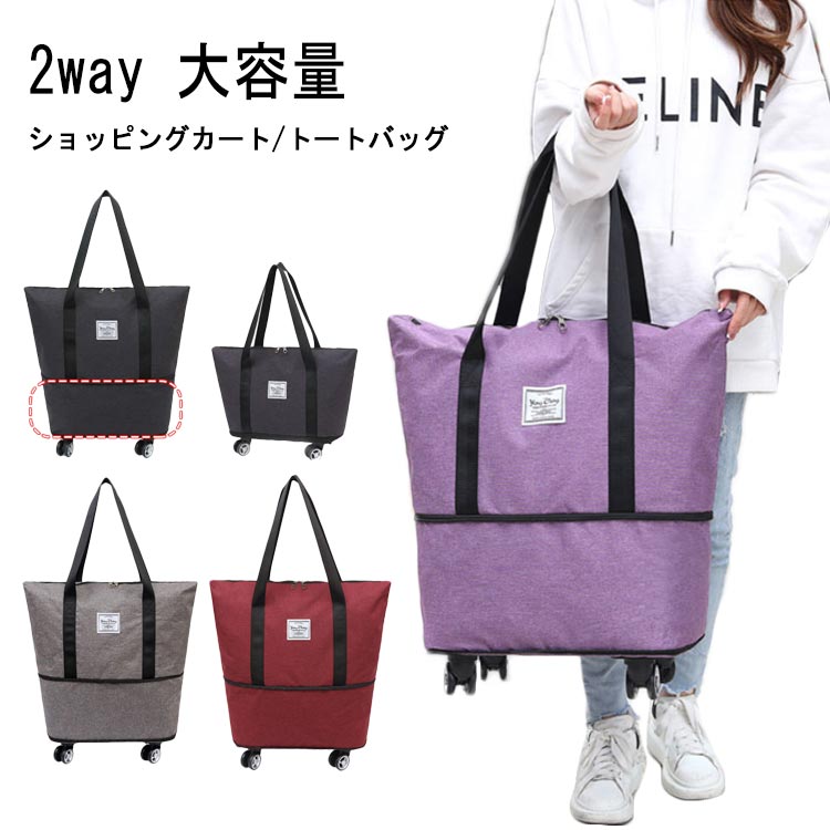 2wayキャリーカート/バッグ、バッグの底のチャックを開けたらカートに変身! まとまったお買い物をしてもコロコロ運べて安心です。 マチが広く、買い物した食材や、ジムのウェアや着替えなどもしっかり収納してくれます。 カートのセットは誰でも簡単ワンタッチ!ランドリーバッグとしても大活躍! | |