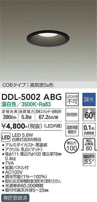DDL-5002ABG 在庫限り ダイコー DAIKO 大光電機 ダウンライト 調光丸タイプSB形 白熱灯60W相当 埋込穴100 温白色 2022年製 管51080