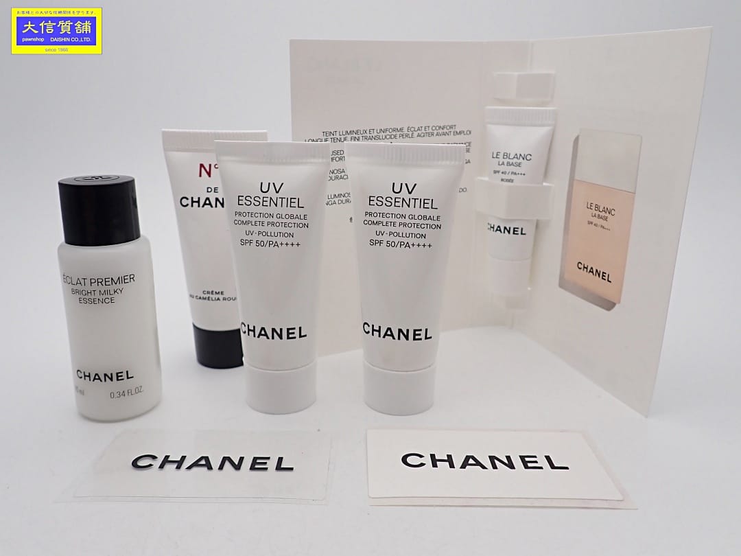 | 特徴 | 日焼け止めジェルクリーム:UV エサンシエル コンプリート SPF 50/PA++++ ×2本。 クリーム:スムース クリーム ドゥ シャネル。 化粧水:エクラ プルミエ ブライト ミルキー エッセンス 容量10ml。 メイクアップベース:ル ブラン ラ バーズ ロゼSPF 40/PA+++ 容量2.5ml。 | ||||||||||||||||
