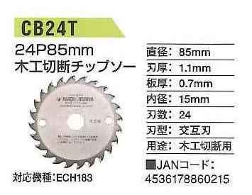 ・直径:85mm、刃厚:1.1mm、板厚:0.7mm、内径:15mm、刃数:24、刃型:交互刃、用途:木工切断用