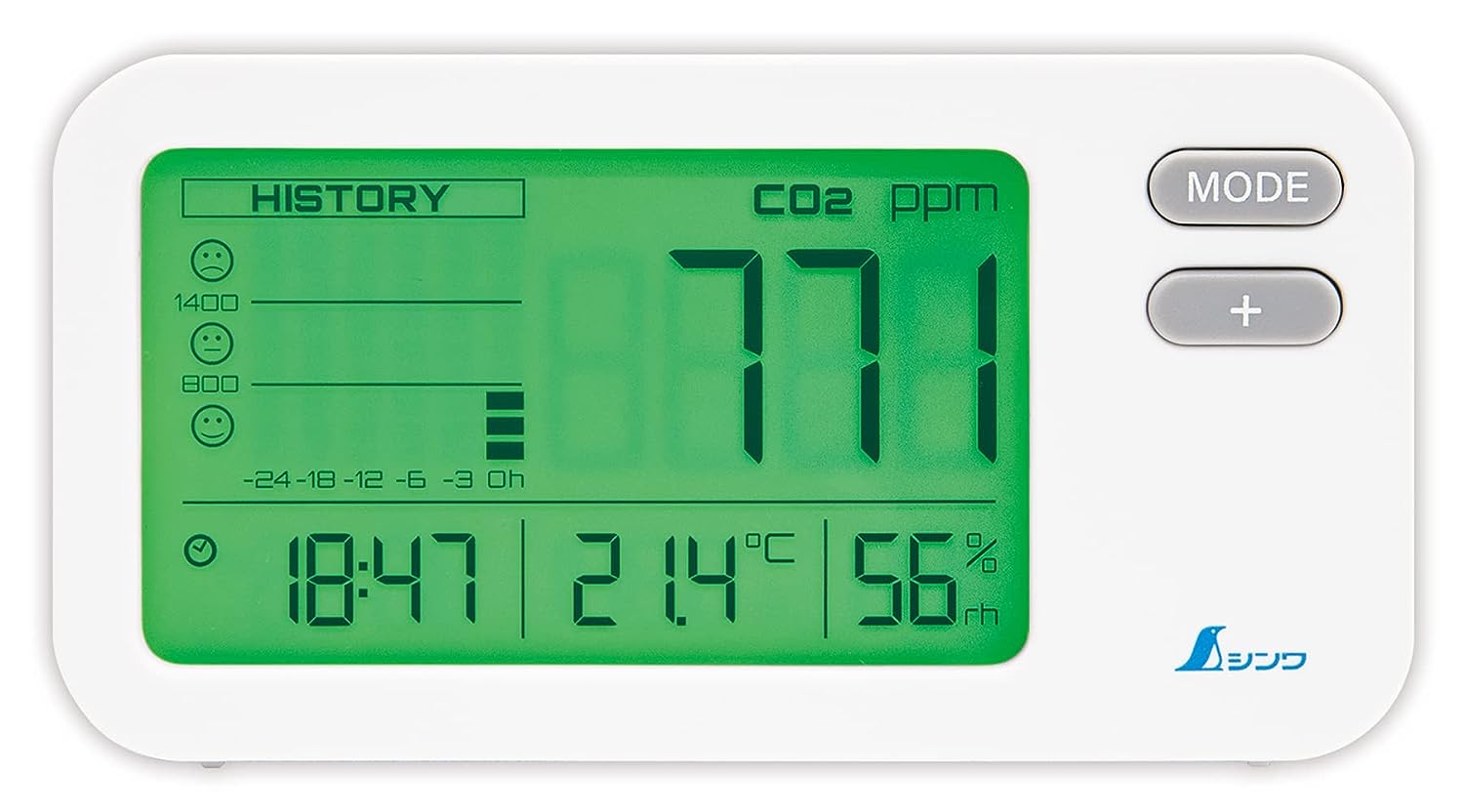 ・空気中の二酸化炭素濃度を数値と色の変化でも表示して注意を促します。通常色(緑)0〜999ppM、喚起推奨色(黄)1.000〜1.999ppM、要換気色(赤)2.000ppM。