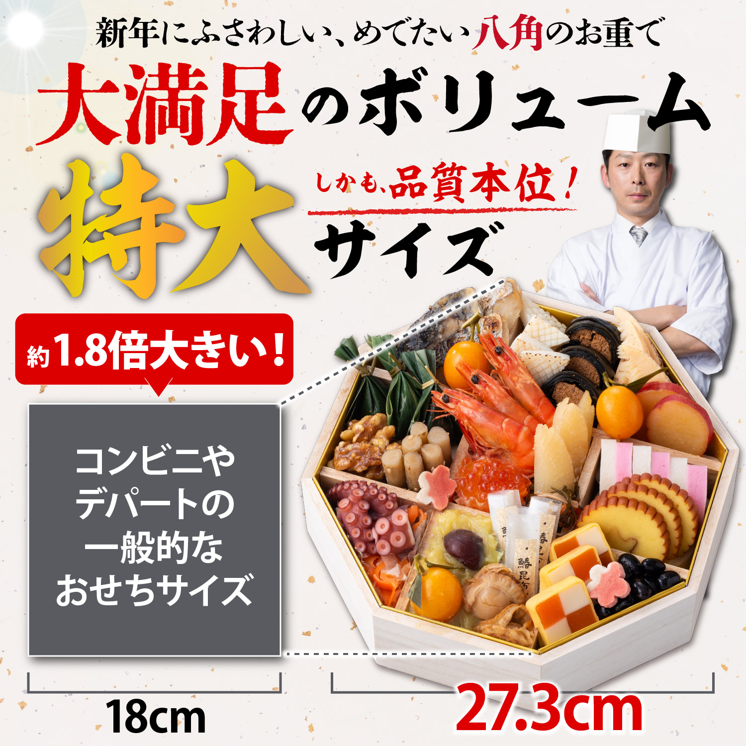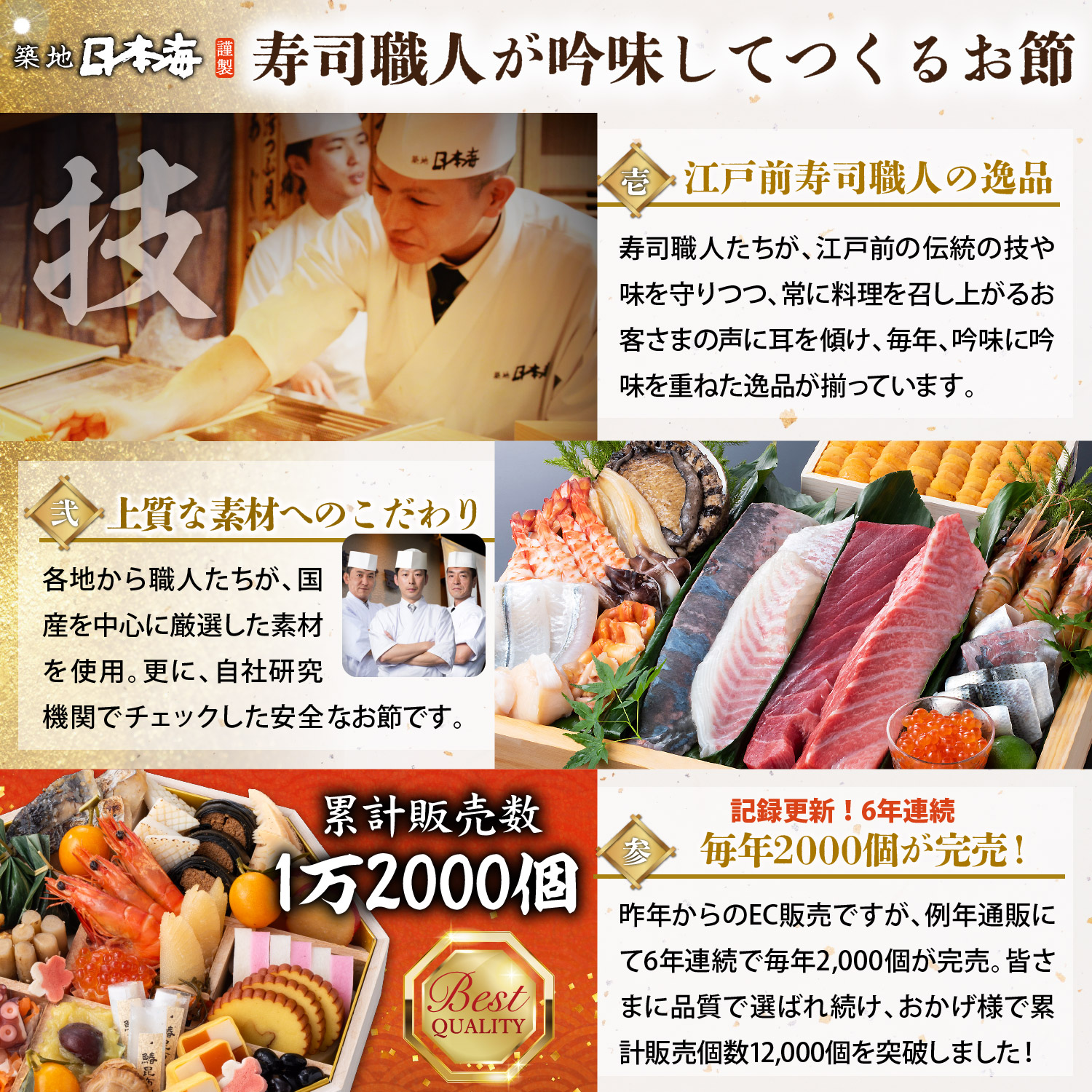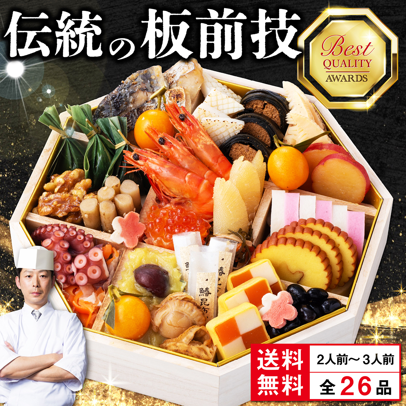 華やかに盛り付けられたネタは全26品目。一つひとつを、まごころこめて丁寧な手仕事で調理していきますので、どうしても数に限りがございます。おかげさまで、毎年2,000個が完売するおせちとなり、選ばれつづけています。