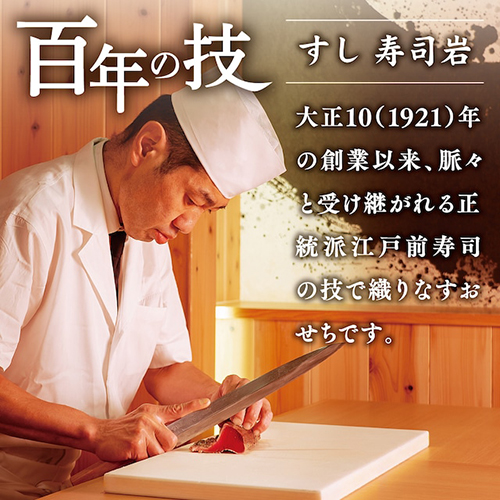 百年の歴史を誇る、老舗寿司屋。伝統の技で織りなす特選おせち大正十年(1921年)の創業以来、正統派江戸前寿司の技を脈々と受け継ぐ、熟練寿司職人がプロデュースしたおせちがこの特選4段重おせち[栄寿]です。永年の経験と知識を活かし、素材の選定から調理方法、盛り付けに至るまで、妥協することなく徹底的に美味しさを追求した自信作。食卓を囲む皆様が、それぞれの蓋を開けるとき、幸あふれる新年の幕も開けます。