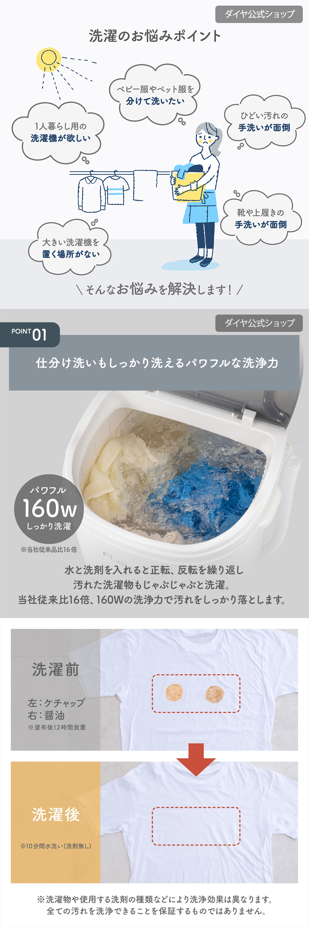 予洗いや仕分け洗いを、パワフル160Wの洗浄力でしっかり洗濯できる、場所を選ばず持ち運びもできる小型洗濯機です。