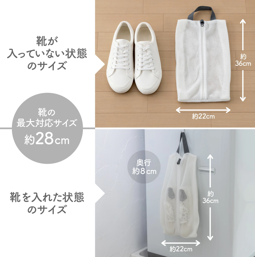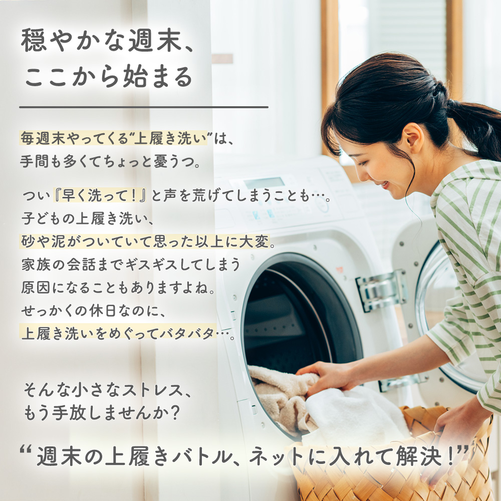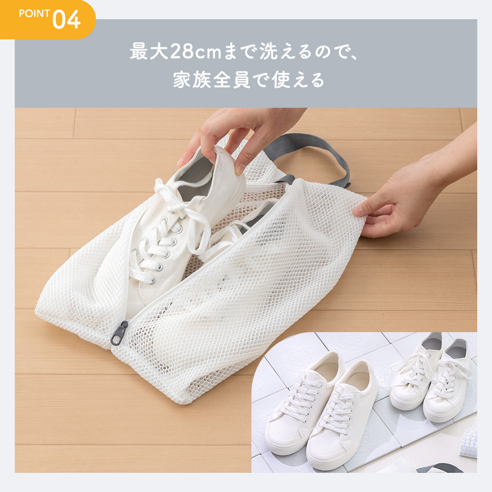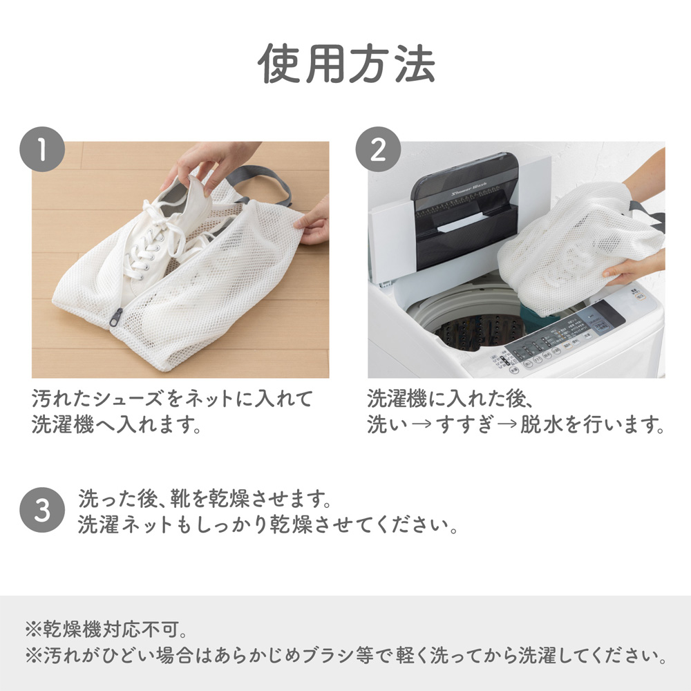 ■ 商品特長 洗濯機で靴の丸洗いができる靴専用の洗濯ネットです。ネット内側全面にやわらかい短毛が密集したブラシが付いた特殊な生地を使用しており、汚れをかき出してしっかり洗えます。最大約28cmまでのスニーカーや上履きが1足洗えます。持ち運びに便利な持ち手付きです。大きな引き手付きのYKKファスナーを採用しているので、小さいお子様からお年寄りの方も開閉しやすいファスナーになっています。 ●頑固な汚れを落とすブラッシング生地 ネット内側全面に、やわらかい短毛が密集したブラシが付いた特殊な 生地を使用しているので、頑固な汚れをかき出してしっかり洗えます。 ●丈夫で持ちやすく開閉しやすい引き手 洗濯ネット専用ファスナーを使用。耐久性に優れ丈夫で持ちやすい引き手です。 ●持ち運びに便利なシューズ型 持ち手が付いているので持ち歩きが簡単です。 ■ 商品仕様 素材:ポリエステル 本体寸法:横約220mm×奥行約80mm×高さ約360mm 本体質量:約80g |