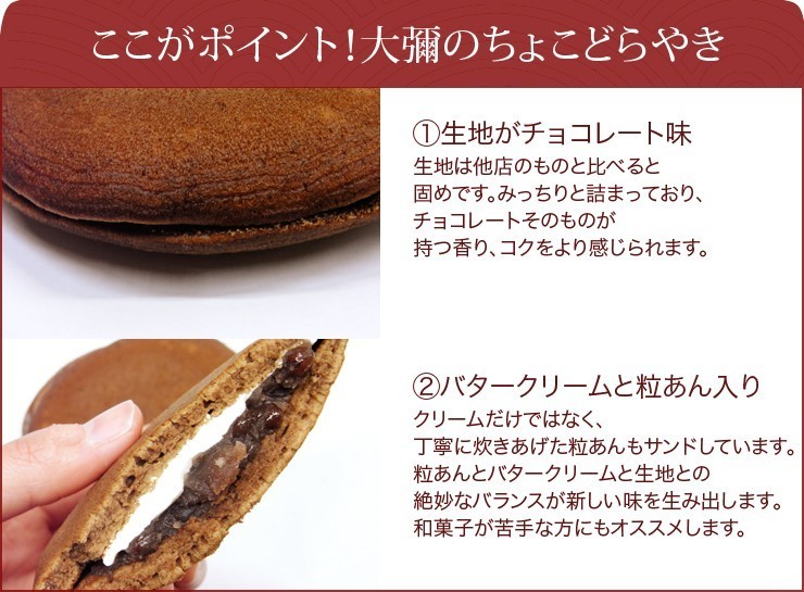 チョコレートの風味と粒あんが絶妙にマッチしたバレンタイン限定のどら焼きです。