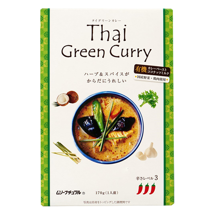 原材料 野菜(なすび、たけのこ)、有機ココナッツミルク(タイ製造)、鶏肉、有機グリーンカレーペースト(有機青唐辛子、有機レモングラス、有機にんにく、有機シャロット、食塩、有機コリアンダーシード、有機ガランガル、有機カフィアライム、有機クミン)、植物油脂、有機砂糖、ナンプラー(魚醤)、赤唐辛子/酸味料(クエン酸)