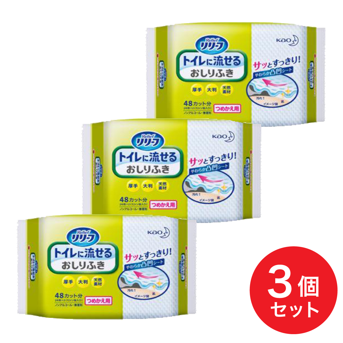 【まとめ買い】花王 リリーフ トイレに流せる おしりふき 詰替用 24枚(ミシン目入り48カット)×3個 無香料 大判 介護用 大人