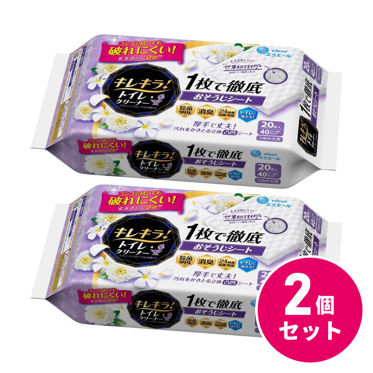 【まとめ買い】エリエール キレキラ! トイレクリーナー つめかえ用 20枚(10枚×2パック) 2個セット クリーンフローラル おそうじシート トイレ掃除