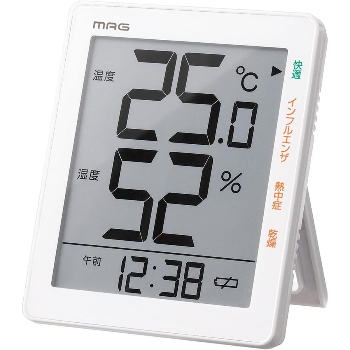ノア精密 MAG マグ 温湿度計 TH-105WH ホワイト 温度 湿度 時間 見やすい 割れにくい 置掛両用 置掛両用 電池交換お知らせ表示 時計 デジタル