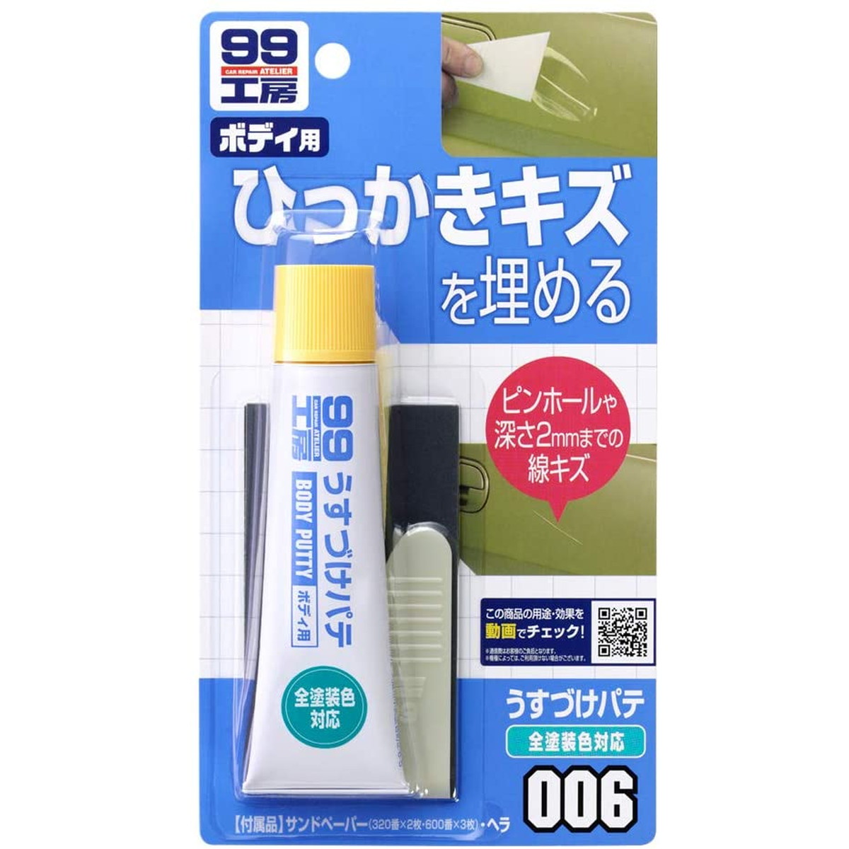 99-9006 うすづけパテ (60g )(ナチュラル)《4975759090069》/アウトドア/自動車用品/メンテナンス/その他深さ1mmほどの小さなヘコミ、ひっかき傷、そして、厚づけパテの気泡を埋めるのに便利な1液性の速乾ラッカーパテ。ヘラ、サンドペーパー付き。ボディカラーに合わせて3色をラインナップしました。内容量60g