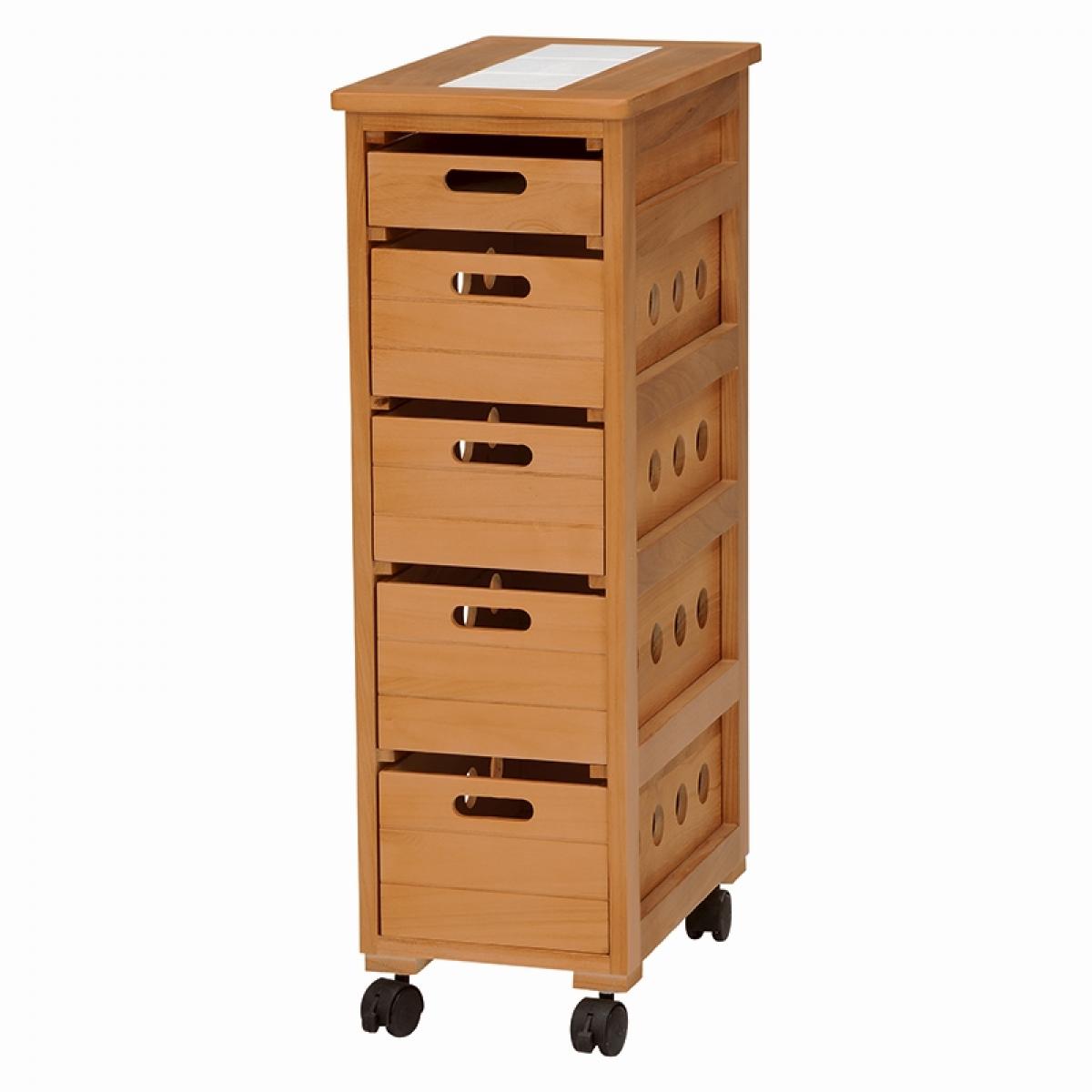 ■キャスター付きでラクラク!通気性のよい木製で野菜ストッカーにピッタリ。タイル天板は熱い鍋などを置くのにも便利。