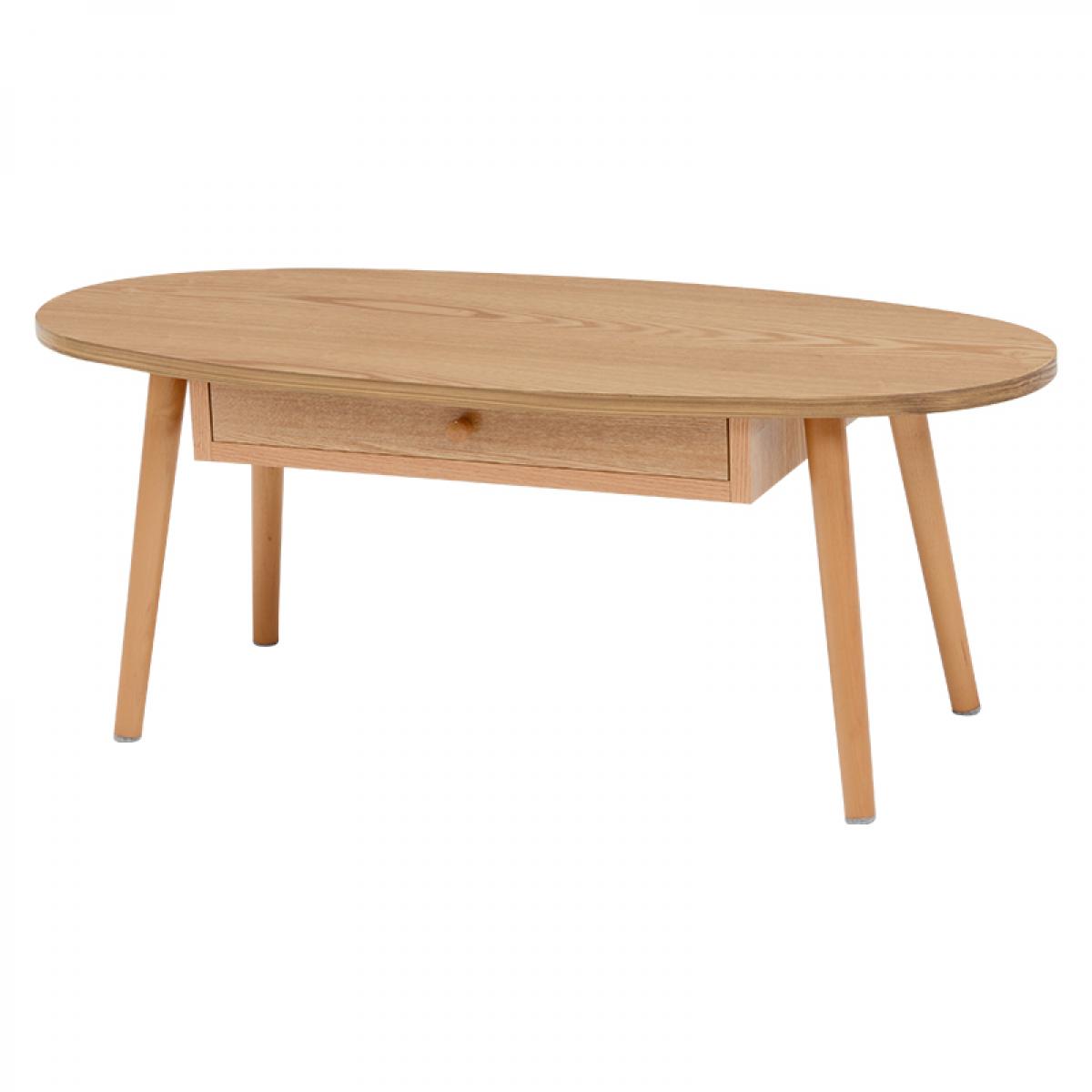 両側から取り出せる引出し付きテーブル。熱や傷に強いUV塗装仕上げ。幅95cm