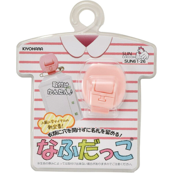 衣類に穴をあけずに名札を留められる「なふだっこ」です。