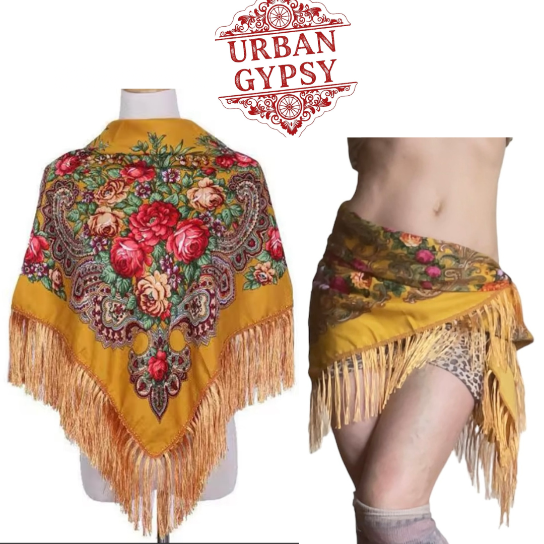 ジプシースタイル スクエアスカーフ フリンジ付き 花柄 イエロー ベリーダンス ヒップスカーフ パレオ 多用途アクセサリー