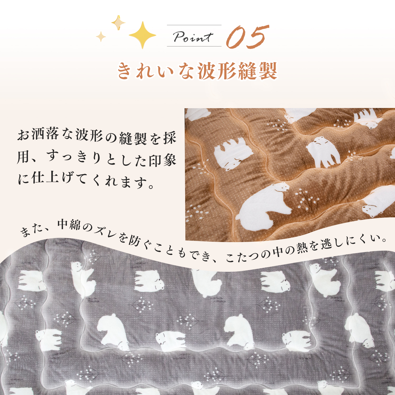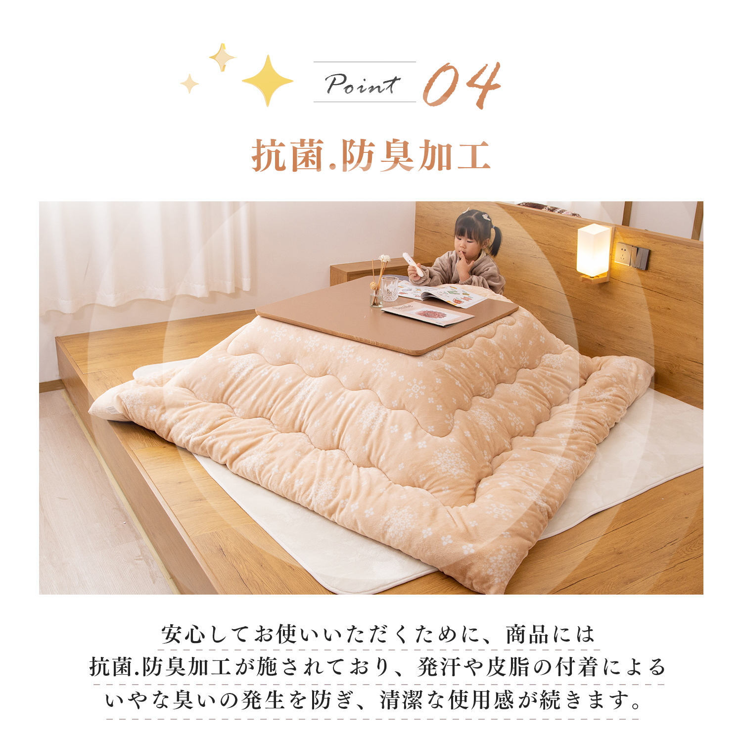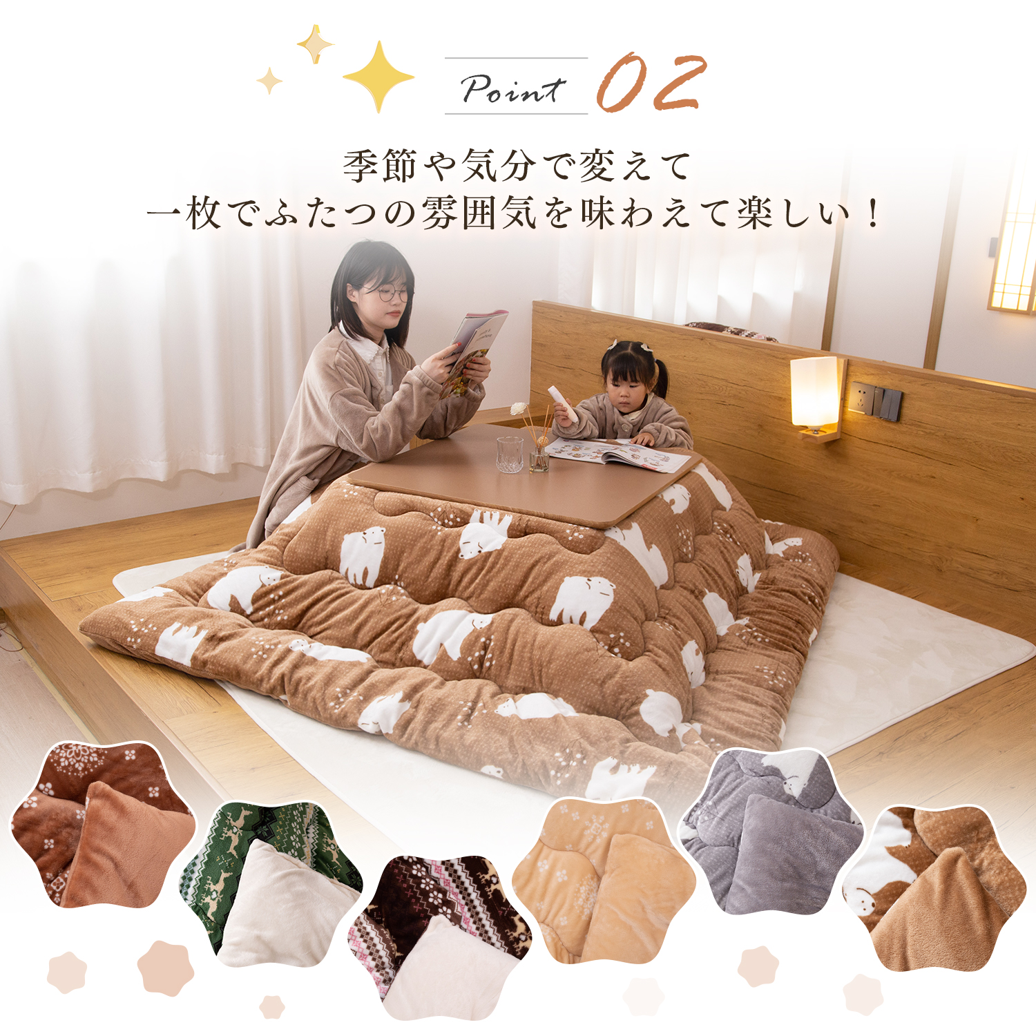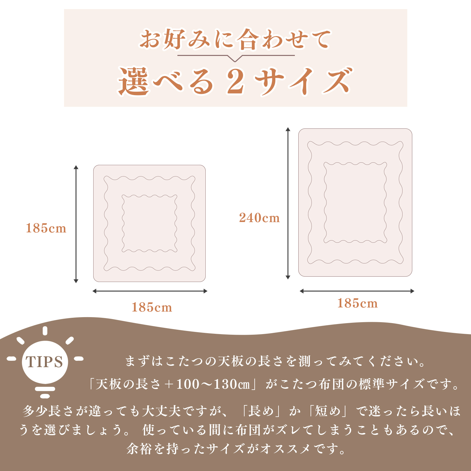 サイズ:185×185cm(対応天板サイズ幅70〜80×奥行70〜80cm) 185×240cm(対応天板サイズ幅70〜80×奥行105〜120cm)</br>本体重量:約2.5kg/3.2kg 中綿重量:約1.9kg/2.3kg