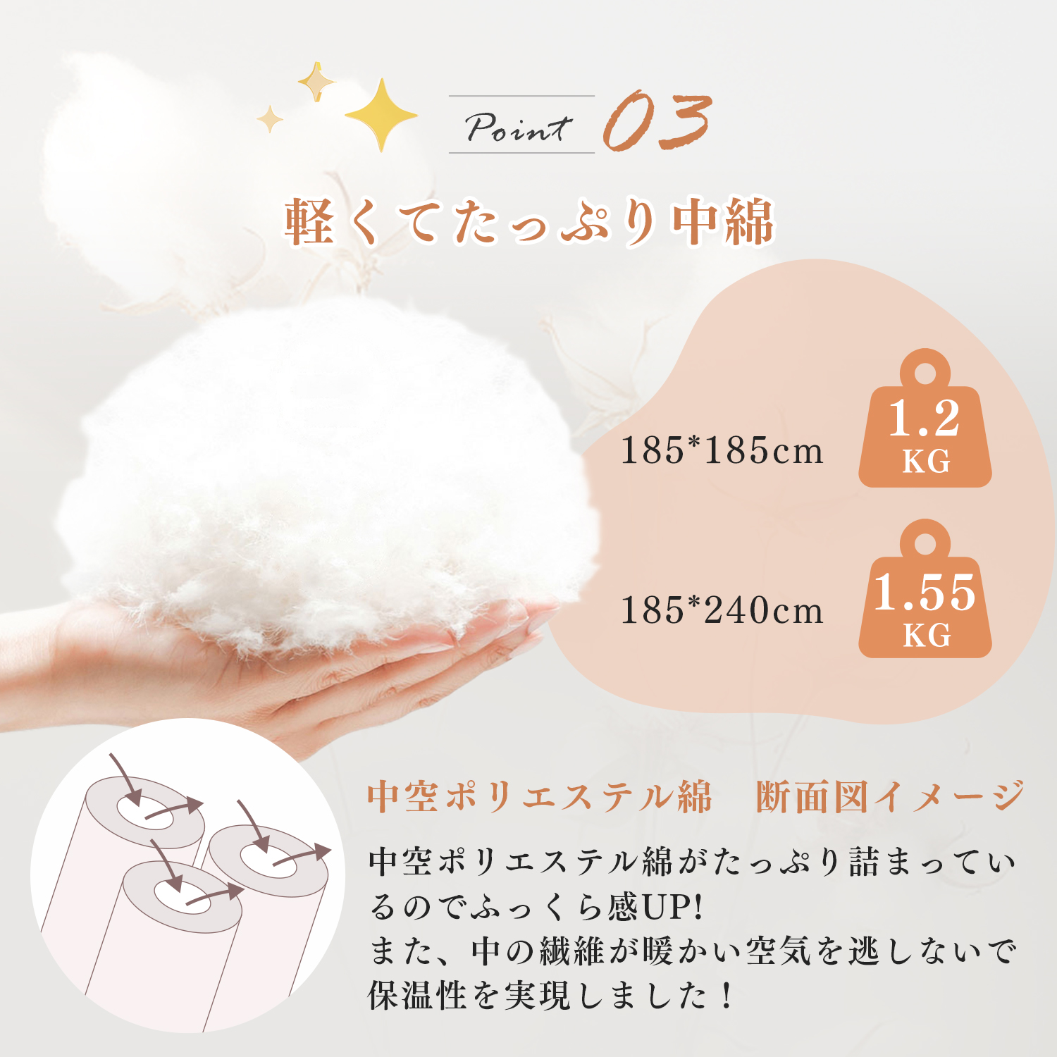 ●掛け布団の表裏には、やわらかで暖かなマイクロファイバー素材を使用し、適度な厚さの中綿を充填し、暖かい空気を逃がさない。