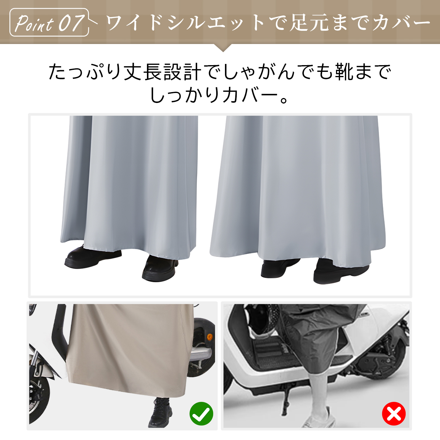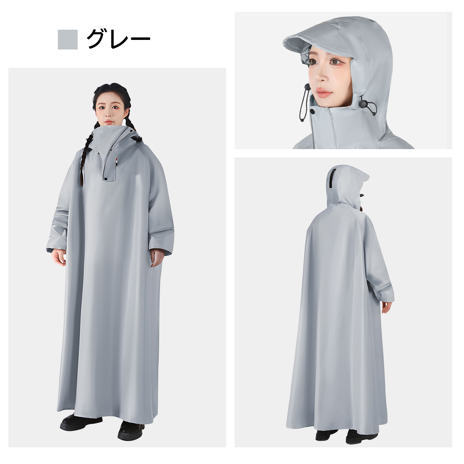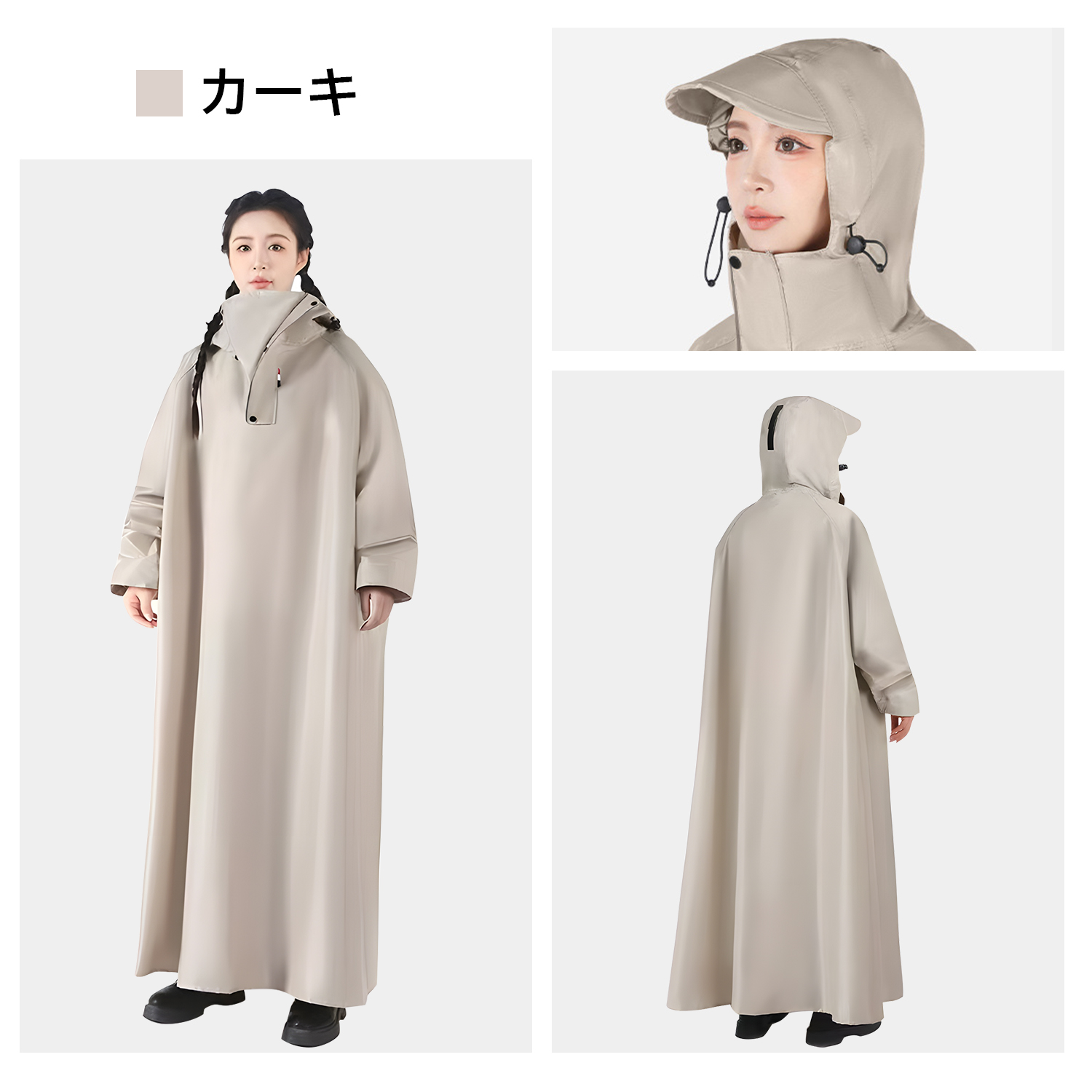 膝下までカバーするロング丈、体がしっかり覆われ、レインブーツを履けば足元まで濡れない、全身を雨から守ることができます。