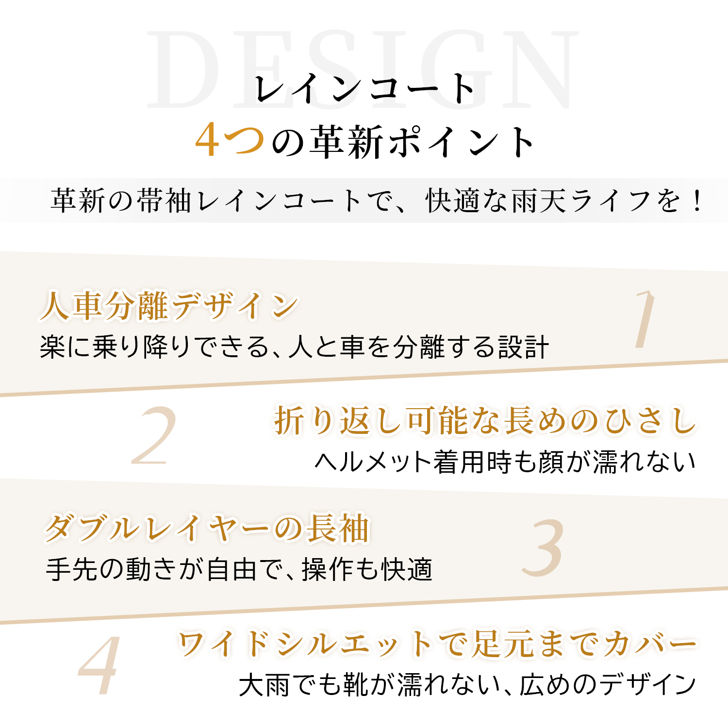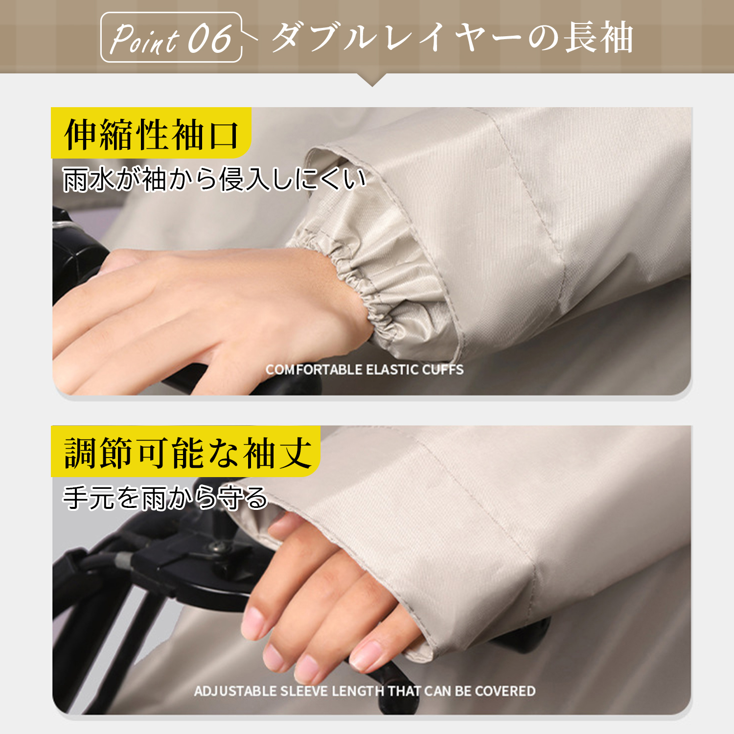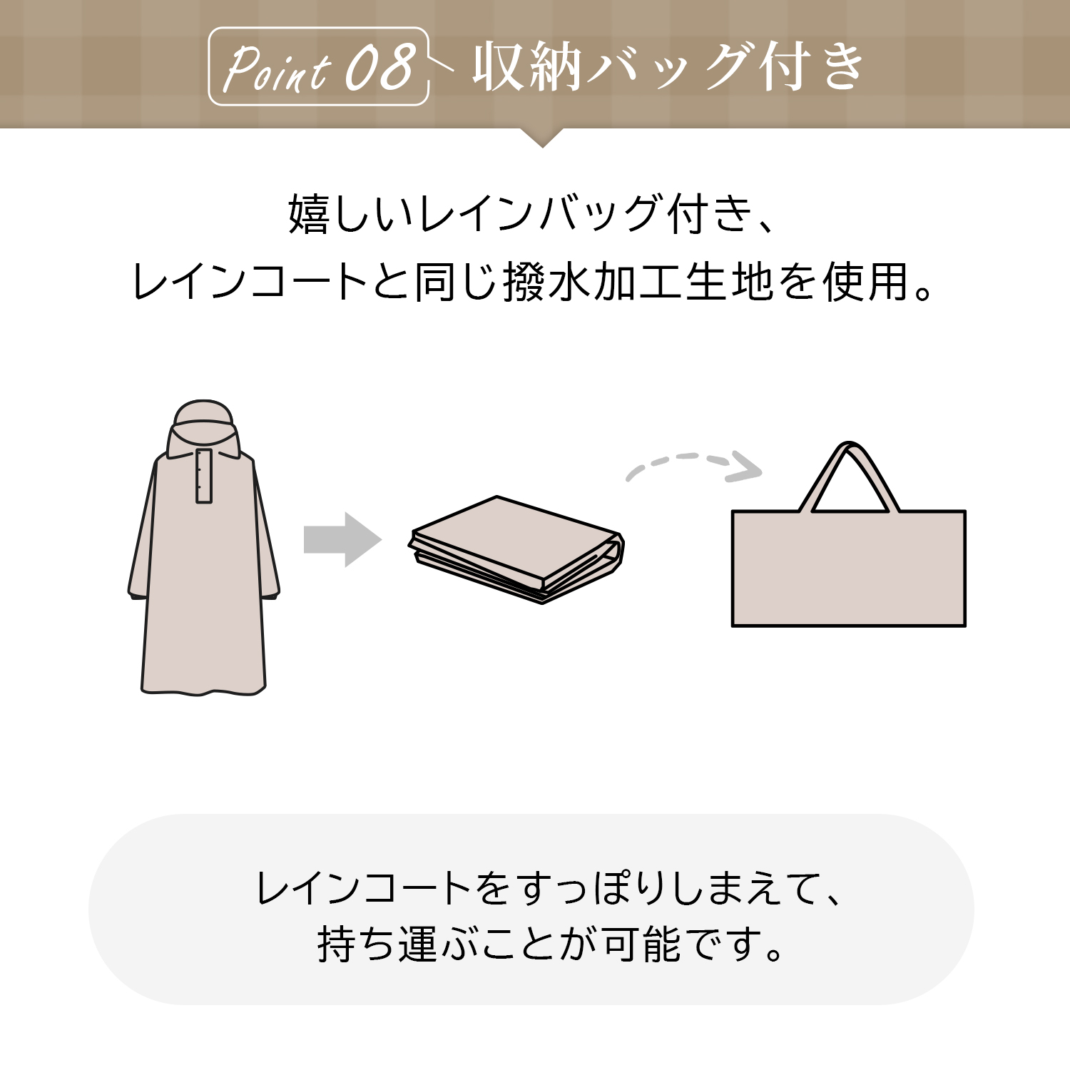 膝下までカバーするロング丈、体がしっかり覆われ、レインブーツを履けば足元まで濡れない、全身を雨から守ることができます。