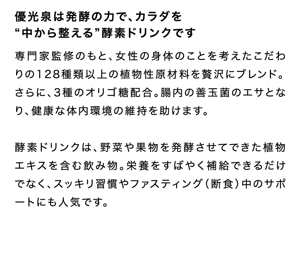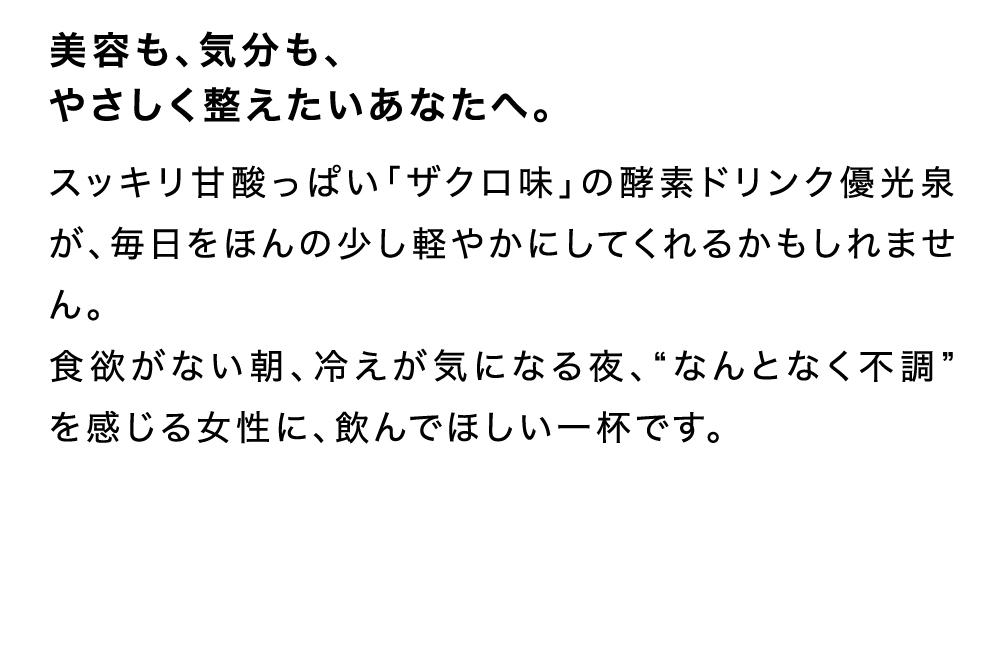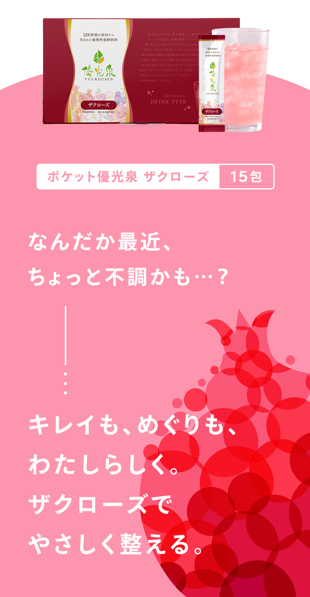 優光泉(ゆうこうせん)ザクローズは女性のコンディションサポート、美容・健康作用のある希少な素材を使用しています。