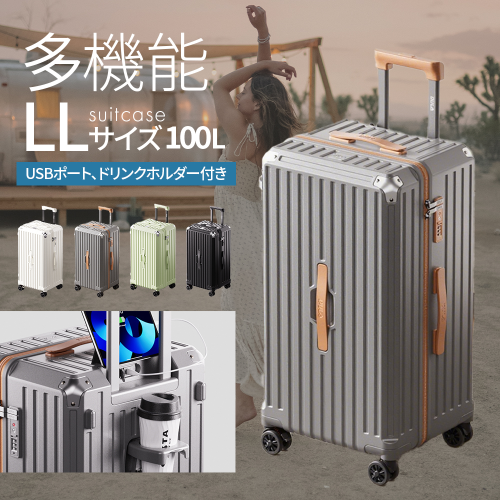 スーツケース LLサイズ 補助キャスターあり 大容量 USBポート 100L キャリーケース TSA ビジネス おしゃれ 出張 海外 合宿 4泊5日 6泊7日 ストッパー付き
