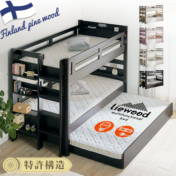 スライド3段ベッド 2,000円OFFクーポン リーウッド エコ塗装 スノコ床 三段ベット 耐荷重700kg 送料無料 特許構造 LED照明コンセント 宮棚 4色 耐震構造
