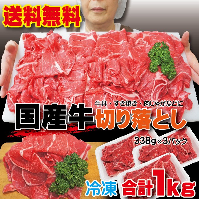 送料無料 国産牛切り落とし 1kg 338g×3パック 冷凍品 2セット以上ご購入でおまけ付き しゃぶしゃぶ すき焼き 焼肉 切落し 訳あり メガ盛り