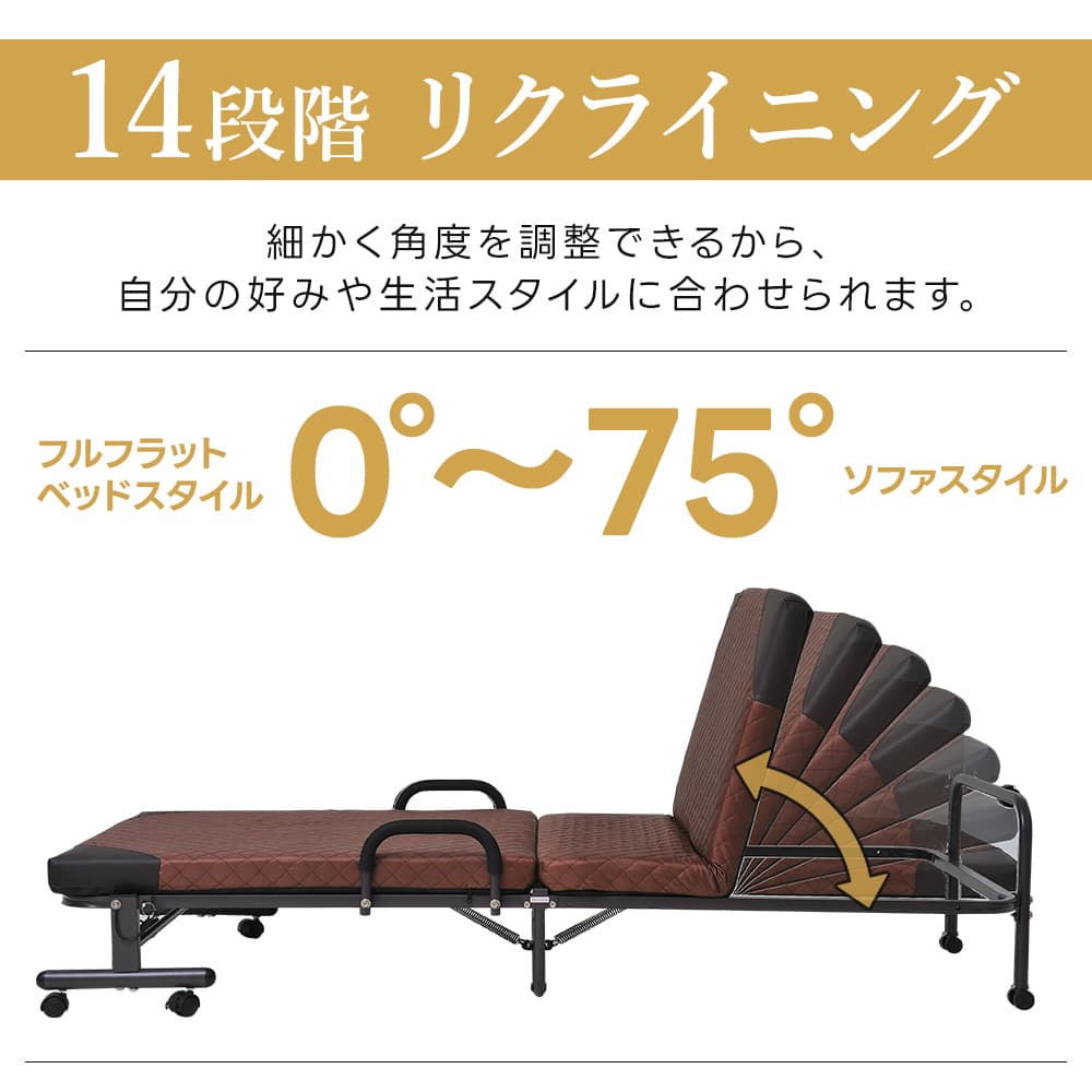 マットレスが付いた折りたたみベッドで、14段階のリクライニング機能を備え、快適な寝心地を提供します。軽量でコンパクトな設計により、簡単に移動や収納が可能です。キャスター付きで移動もスムーズ。組立も簡単で、ほぼ完成品となっており、女性でも気軽に組立可能です。一人暮らしや単身赴任、来客用として最適です。