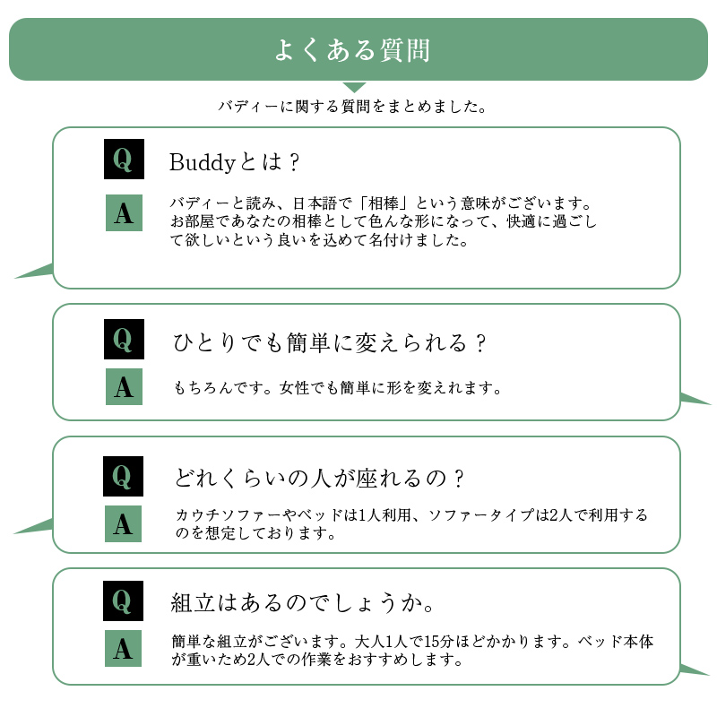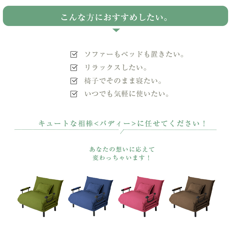 本品は主に、床や畳の上に座る際に、腰を下ろすための「家庭用ソファ」です。また、本体を広げることによって、仮眠用ベッドとしても利用可能です。それ以外の用途や、常用ベッドなどには適しませんので、説明書の内容をよく読み、正しくご使用くださるようお願いいたします。