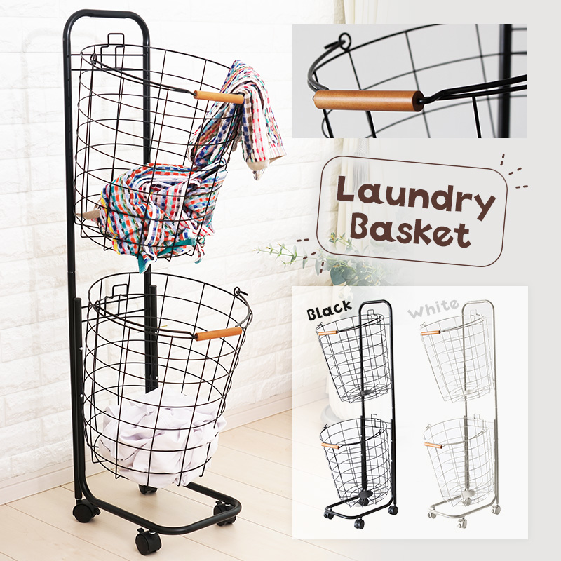 ランドリーバスケット おしゃれ 2段 スリム ランドリーワゴン 洗濯カゴ キャスター付き 大容量 収納ラック ワイヤー メッシュ 脱衣カゴ