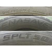 [管理番号] L20024 [メーカー] ダンロップ(DUNLOP) [品名] ENASAVE SPLT50 [サイズ] 215/70R17.5 118/116L [製造年] 2018.2019年製 (日本製) [残溝] センター付近:約6.9-7.0mm [本数] 2本 サイドウォール傷有りですが、ホイール組込等に問題の無い程度だと思います。