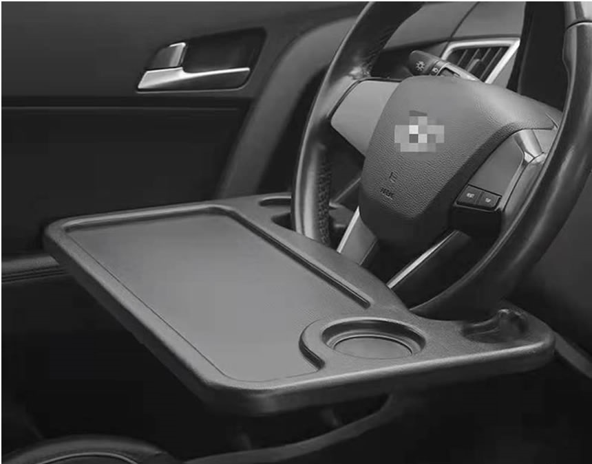 、車用ハンドルテーブルはドリンク・文房具からパソコンまで簡単に載れます。