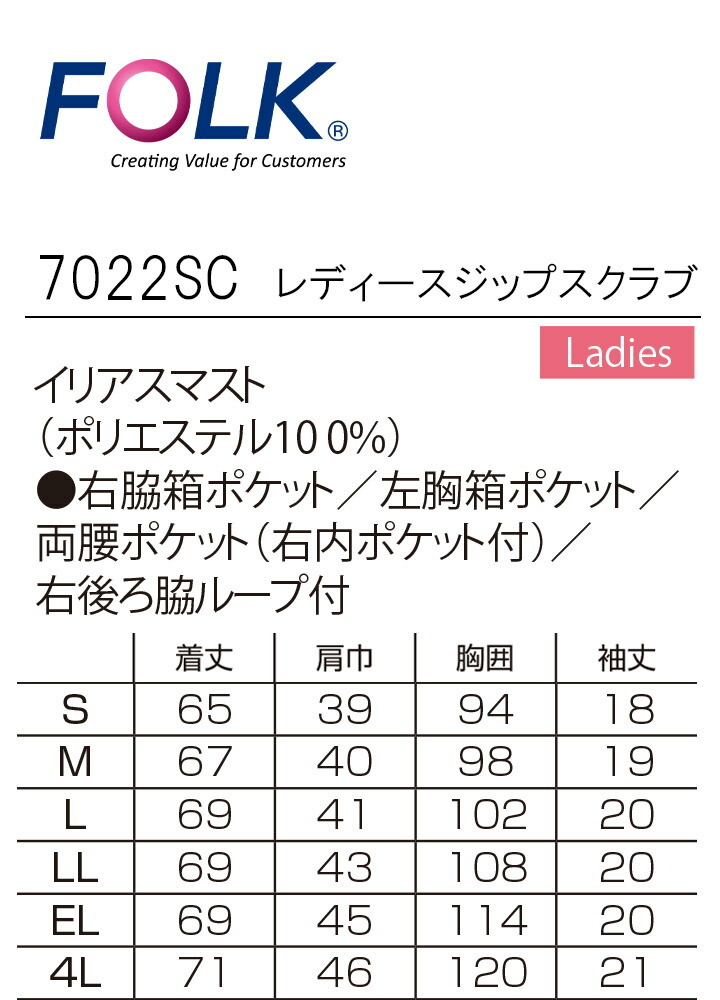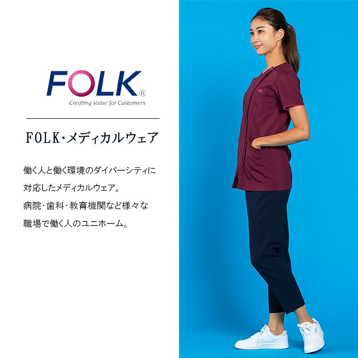 フォーク FOLK スクラブ 医療 上衣 羽織って着るジップスクラブ 女性用 FOLK7022SC ユニフォーム 白衣 クリニック フォーク 術衣