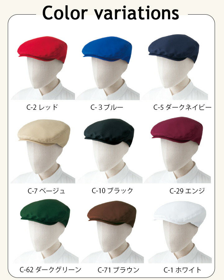| 説明 特徴 | 飲食をはじめ、さまざまなシーンで活躍。 デパ地下やベーカリーなど、おしゃれな雰囲気を演出するなら、かぶるだけでコーディネートが上品に仕上がるハンチングがおすすめ。 耐塩素加工の素材で退色を防ぎ、きれいな色が持続します。 |