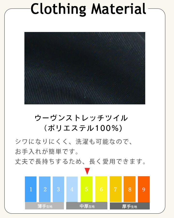 | 素材 | ウーブンストレッチツイル(ポリエステル100%) |