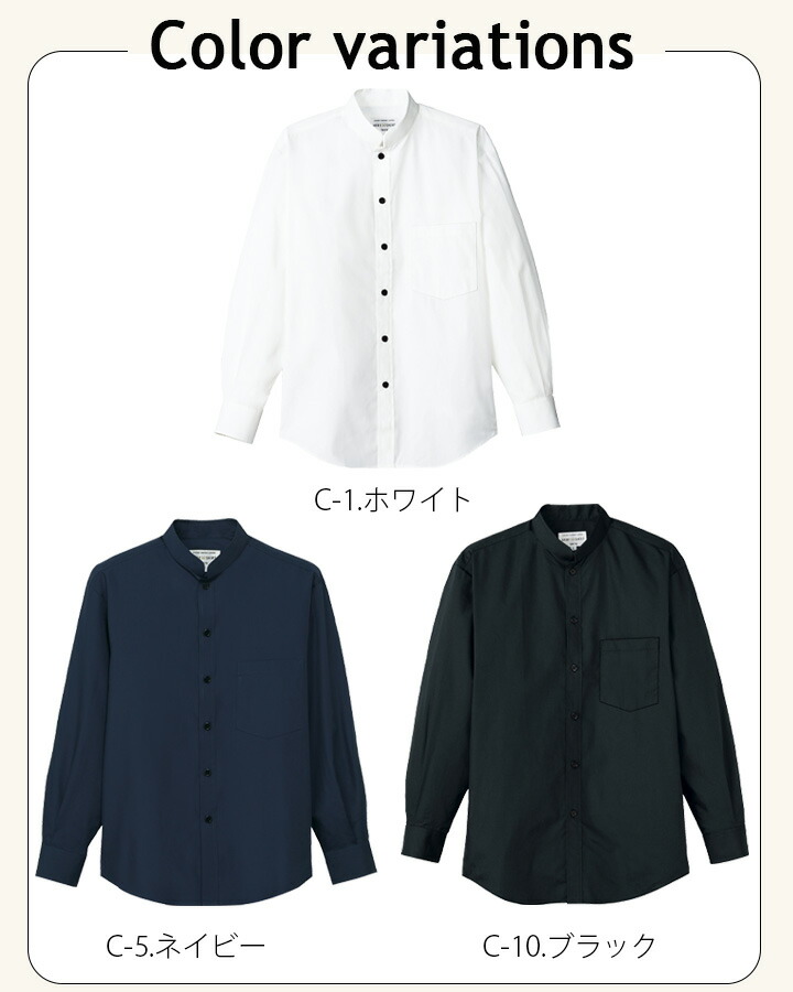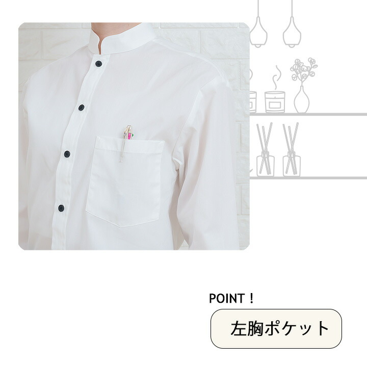説明 特徴 | 飲食をはじめ、さまざまなシーンで活躍。 コーディネート次第で雰囲気が変わるスタンドカラーシャツ。 一枚で着るのはもちろん インナーとしても使えます。 |