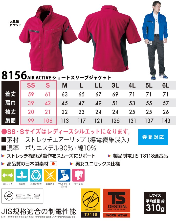 TSデザイン AIR ACTIVE ショートスリーブジャケット 8156 半袖ジャケット ブルゾン 藤和 ストレッチ 春夏 日本製 ユニセックス 作業服 作業着 810シリーズ