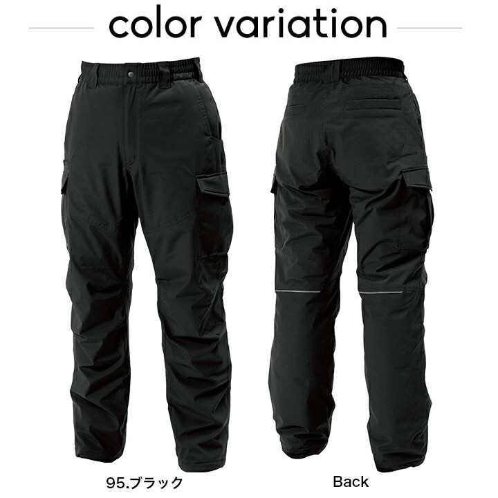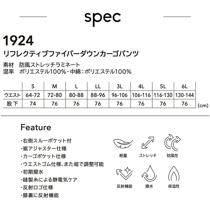 | 説明 特徴 | ・右側スルーポケット付 ・裾アジャスター仕様 ・カーゴポケット仕様 ・ウエストゴム仕様、また紐で調整可能 ・初期撥水 ・縫製糸による静電気ケア ・反射ロゴ仕様 ・膝裏に反射機能 |