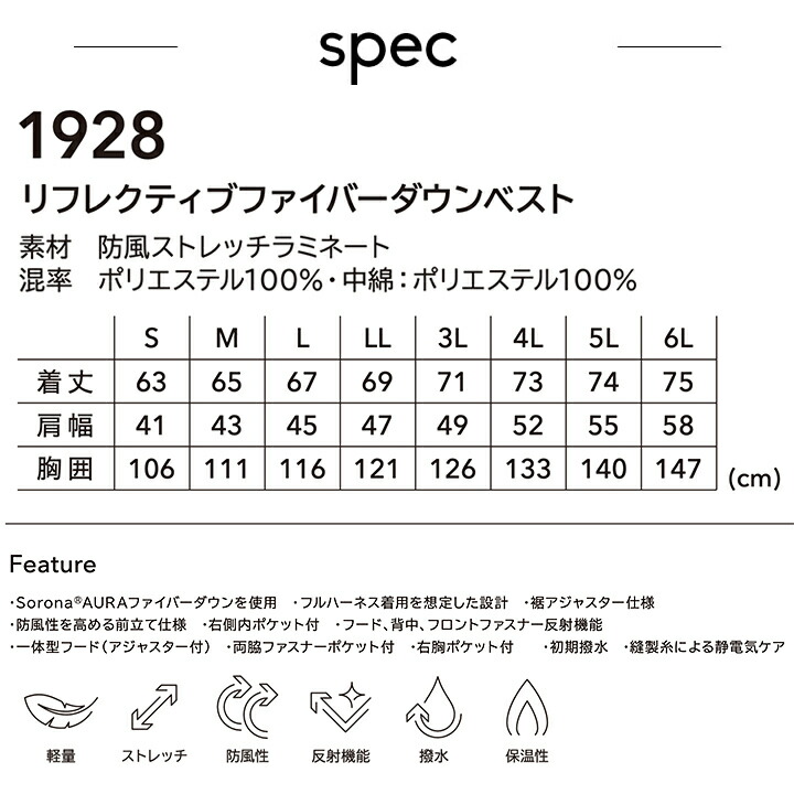| 説明 特徴 | ・Sorona AURAファイバーダウンを使用 ・フルハーネス着用を想定した設計 ・裾アジャスター仕様 ・防風性を高める前立て仕様 ・右側内ポケット付 ・フード、背中、フロントファスナー反射機能 ・一体型フード(アジャスター付) ・両脇ファスナーポケット付 ・右脇ポケット付 ・初期撥水 ・縫製糸による静電気ケア |