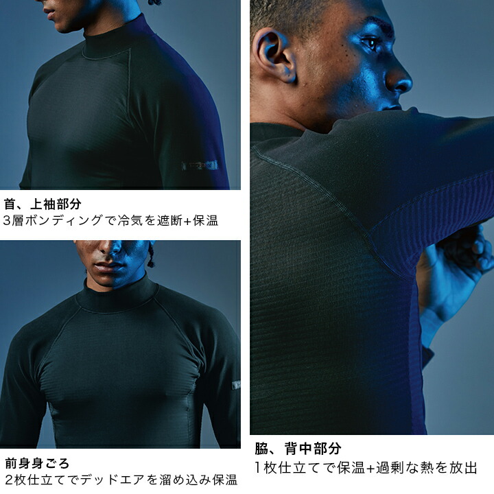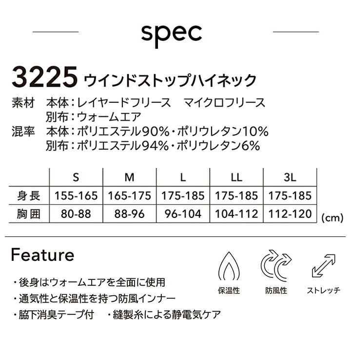 | 説明 特徴 | ・後身はウォームエアを全面に使用 ・通気性と保温性を持つ防風インナー ・脇下消臭テープ付 ・縫製糸による静電気ケア |