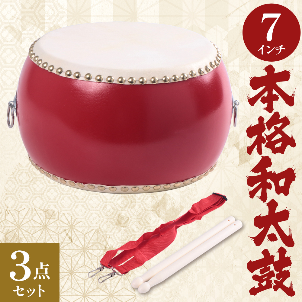 和太鼓セット セット 7インチ 子供 キッズ 大人 バチ 首掛け 首かけ アジャスター付き 羊皮 応援 おもちゃ 運動会 スポーツ お祭り 鋲打ち 野球 和太鼓 たいこ