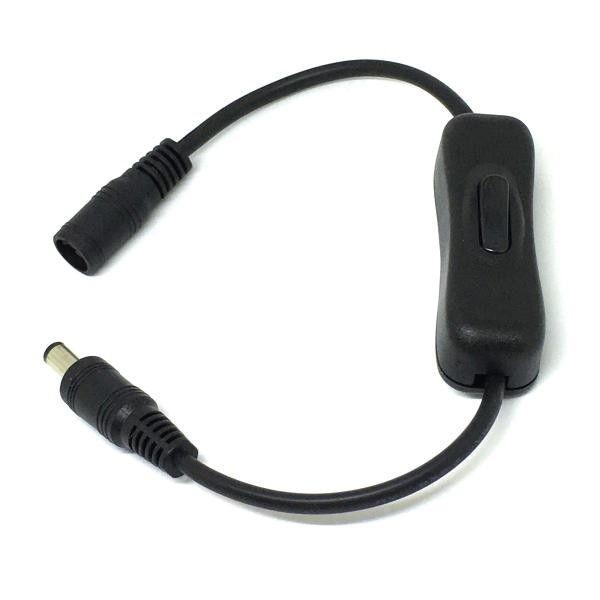 電源スイッチのないテープライトなどの LED 照明器具をこのスイッチ経由でつなぐと,電源をいれたり,きったりすることができるようになります.コネクタのサイズはひろく使用されている 5.5mm × 2.1mm です.片側はメス,反対側はオスのコネクタがついています.