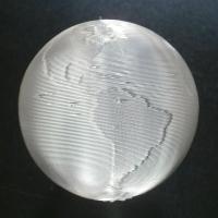 通常の 3D 印刷とはちがう新開発技術 (特許出願中) によって,らせん状にひと巻きだけして 3D 印刷してつくった,とても軽い 2〜6 cm の中空の地球儀 です.つまり,海の部分と陸の部分とでふとさがちがう透明なプラスティック (PLA) のフィラメント (細いひも) を,3D プリンタでひと巻きだけ,らせん状にかさねて,つくっています.印刷のようすを YouTube でみることができます.他の商品とあわせて何個でも定型外郵便料金 (120 円) で配送します.