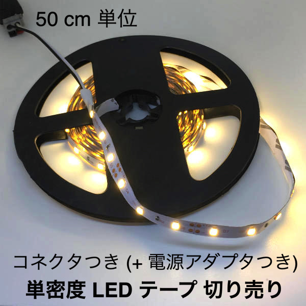 テープの長さは上記のオプションで指定してください.50 cm 単位で余るときは,10 cm 単位ではさみで切断して使用してください (5 cm 単位で切断できるテープもあります).付属する電源アダプタはテープのながさ (注文数量) によってことなります.